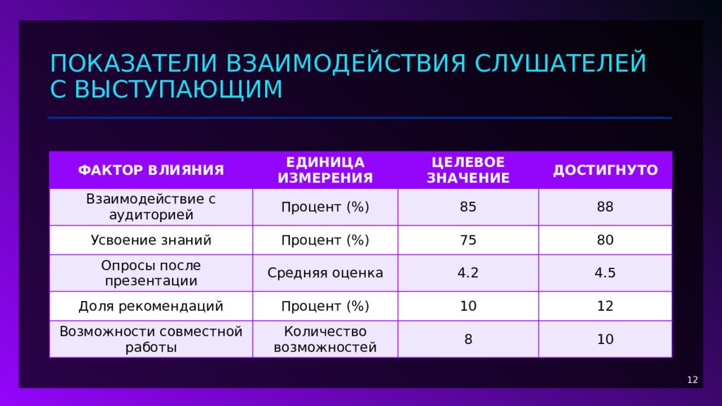 ФАКТОР ВЛИЯНИЯ ЕДИНИЦА ИЗМЕРЕНИЯ ЦЕЛЕВОЕ ЗНАЧЕНИЕ ДОСТИГНУТО Взаимодействие с аудиторией Процент (%) 85 88 Усвоение знаний Процент (%) 75 80 Опросы после презентации Средняя оценка 4.2 4.5 Доля рекомендаций Процент (%) 10 12 Возможности совместной работы Количество возможностей 8 10 12