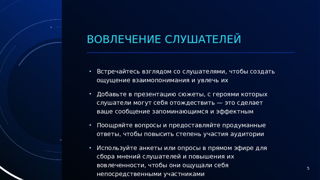 Встречайтесь взглядом со слушателями, чтобы создать ощущение взаимопонимания и увлечь их Добавьте в презентацию сюжеты, с героями которых слушатели могут себя отождествить — это сделает ваше сообщение запоминающимся и эффектным Поощряйте вопросы и предоставляйте продуманные ответы, чтобы повысить степень участия аудитории Используйте анкеты или опросы в прямом эфире для сбора мнений слушателей и повышения их вовлеченности, чтобы они ощущали себя непосредственными участниками 5