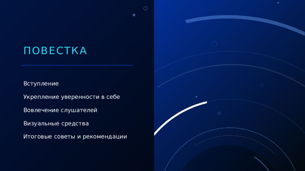 Вступление Укрепление уверенности в себе Вовлечение слушателей Визуальные средства Итоговые советы и рекомендации