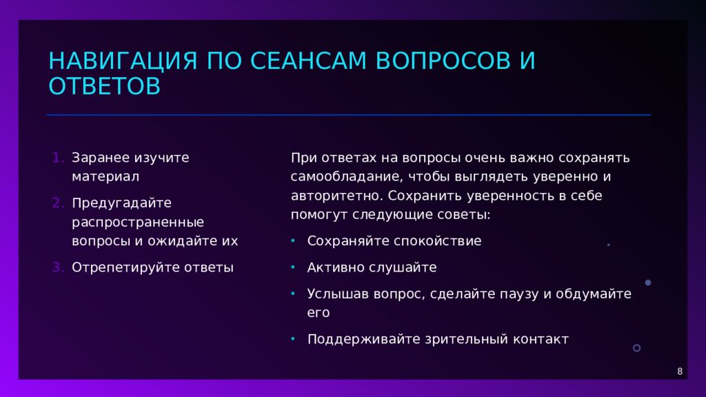 Заранее изучите материал Предугадайте распространенные вопросы и ожидайте их Отрепетируйте ответы При ответах на вопросы очень важно сохранять самообладание, чтобы выглядеть уверенно и авторитетно. Сохранить уверенность в себе помогут следующие советы: Сохраняйте спокойствие Активно слушайте Услышав вопрос, сделайте паузу и обдумайте его Поддерживайте зрительный контакт 8