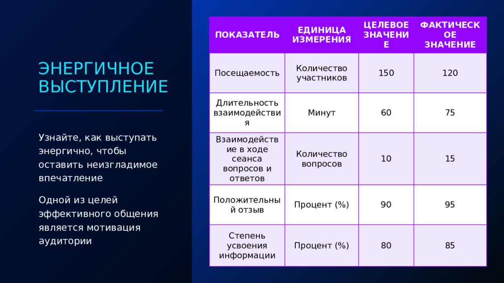 Узнайте, как выступать энергично, чтобы оставить неизгладимое впечатление Одной из целей эффективного общения является мотивация аудитории ПОКАЗАТЕЛЬ ЕДИНИЦА ИЗМЕРЕНИЯ ЦЕЛЕВОЕ ЗНАЧЕНИЕ ФАКТИЧЕСКОЕ ЗНАЧЕНИЕ Посещаемость Количество участников 150 120 Длительность взаимодействия Минут 60 75 Взаимодействие в ходе сеанса вопросов и ответов Количество вопросов 10 15 Положительный отзыв Процент (%) 90 95 Степень усвоения информации Процент (%) 80 85