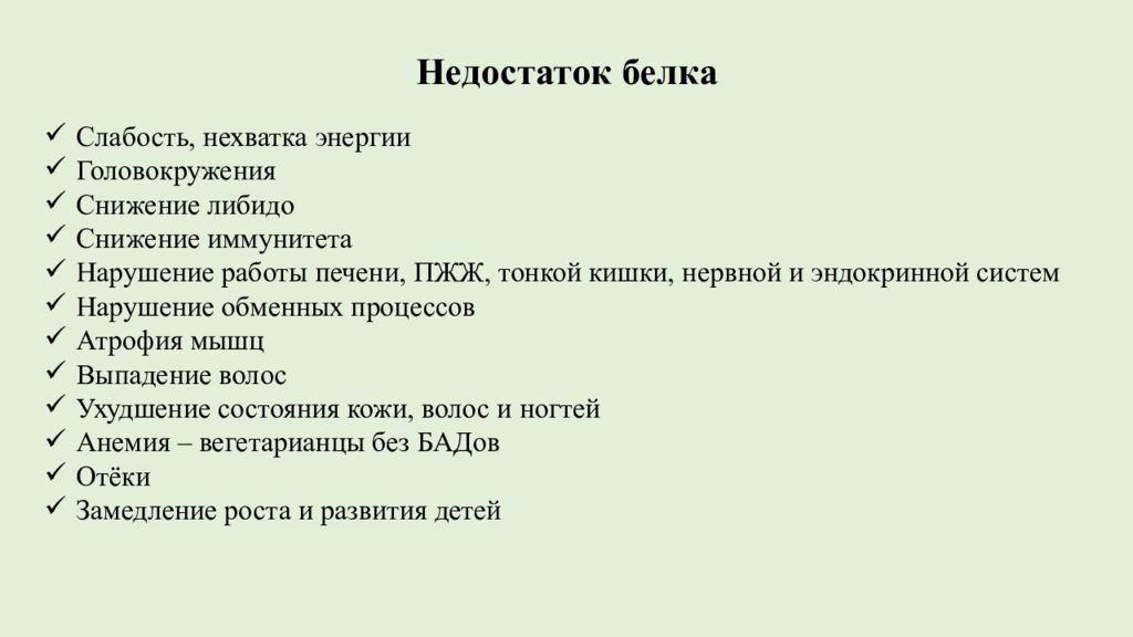 Недостаток белка Слабость, нехватка энергии Головокружения Снижение либидо Снижение иммунитета Нарушение работы печени, ПЖЖ, тонкой кишки, нервной и эндокринной систем Нарушение обменных процессов Атрофия мышц Выпадение волос Ухудшение состояния кожи, волос и ногтей Анемия – вегетарианцы без БАДов Отёки Замедление роста и развития детей