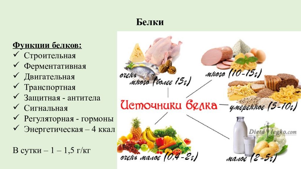 Белки Функции белков: Строительная Ферментативная Двигательная Транспортная Защитная - антитела Сигнальная Регуляторная - гормоны Энергетическая – 4 ккал В сутки – 1 – 1,5 г/кг