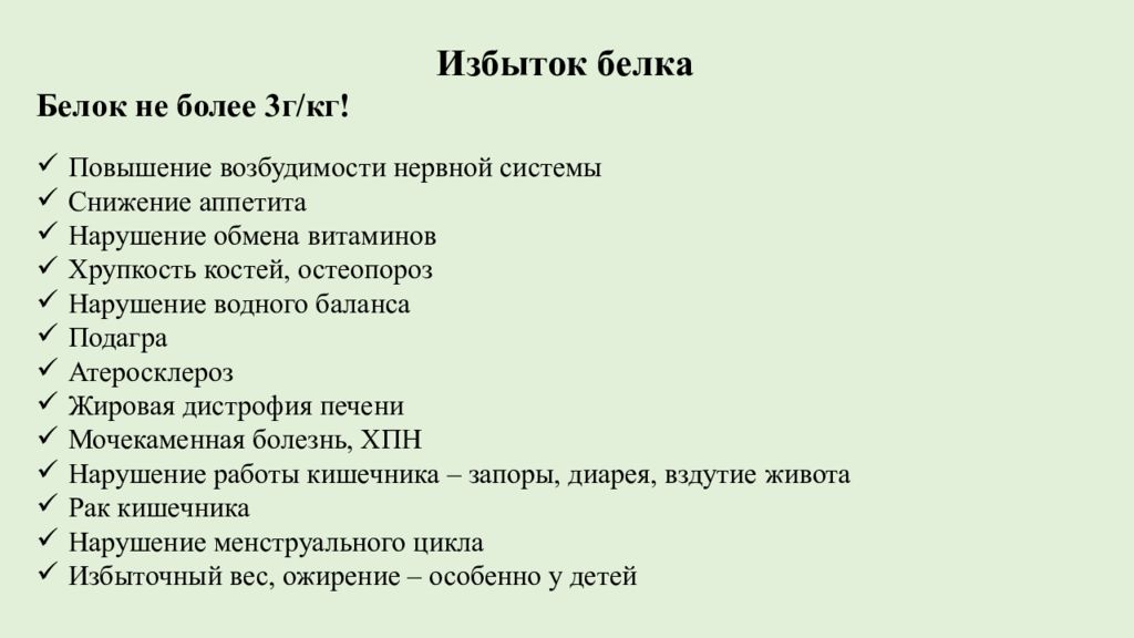 Избыток белка Белок не более 3г/кг! Повышение возбудимости нервной системы Снижение аппетита Нарушение обмена витаминов Хрупкость костей, остеопороз Нарушение водного баланса Подагра Атеросклероз Жировая дистрофия печени Мочекаменная болезнь, ХПН Нарушение работы кишечника – запоры, диарея, вздутие живота Рак кишечника Нарушение менструального цикла Избыточный вес, ожирение – особенно у детей