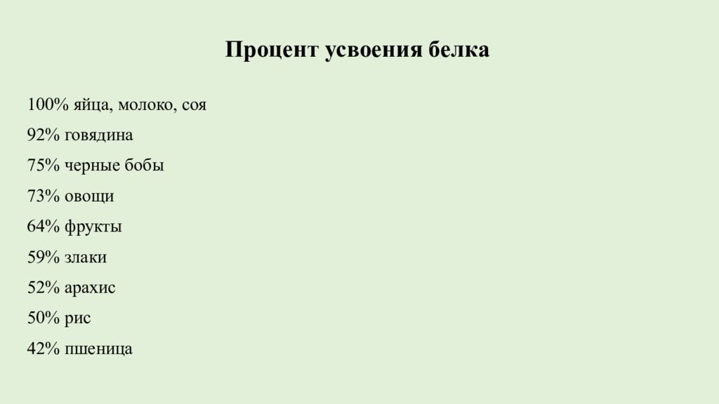 Процент усвоения белка 100% яйца, молоко, соя 92% говядина 75% черные бобы 73% овощи 64% фрукты 59% злаки 52% арахис 50% рис 42% пшеница