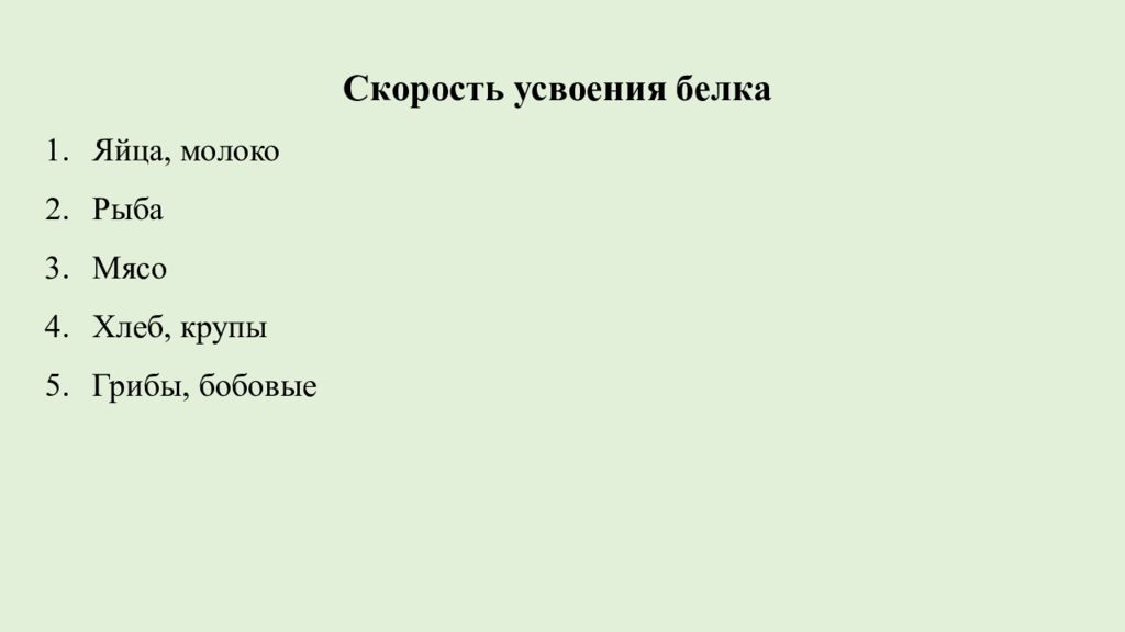 Скорость усвоения белка Яйца, молоко Рыба Мясо Хлеб, крупы Грибы, бобовые