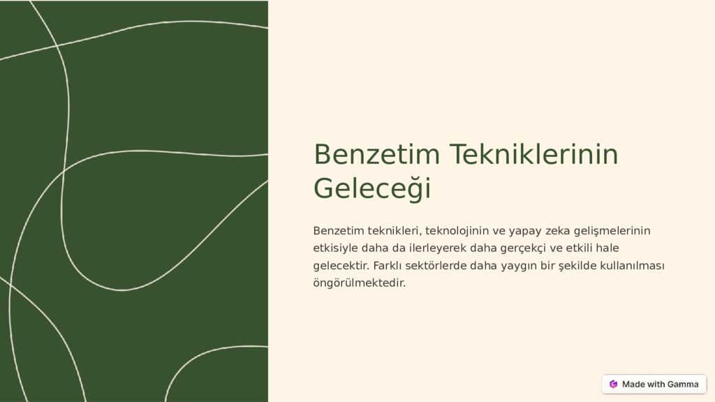 Benzetim Tekniklerinin Geleceği Benzetim teknikleri, teknolojinin ve yapay zeka gelişmelerinin etkisiyle daha da ilerleyerek daha gerçekçi ve etkili hale gelecektir. Farklı sektörlerde daha yaygın bir şekilde kullanılması öngörülmektedir.