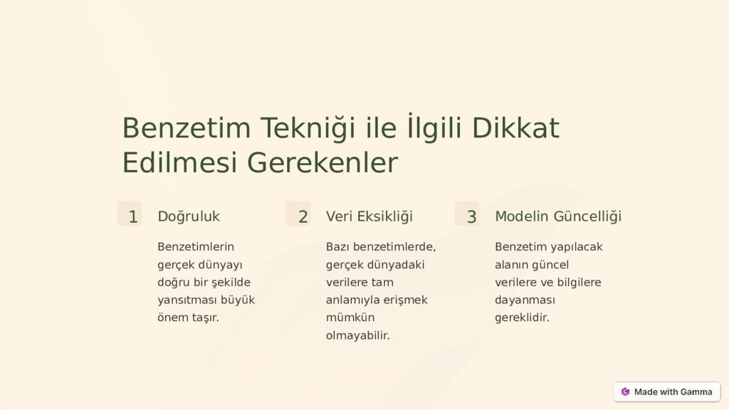Benzetim Tekniği ile İlgili Dikkat Edilmesi Gerekenler 1 Doğruluk Benzetimlerin gerçek dünyayı doğru bir şekilde yansıtması büyük önem taşır. 2 Veri Eksikliği Bazı benzetimlerde, gerçek dünyadaki verilere tam anlamıyla erişmek mümkün olmayabilir. 3 Modelin Güncelliği Benzetim yapılacak alanın güncel verilere ve bilgilere dayanması gereklidir.