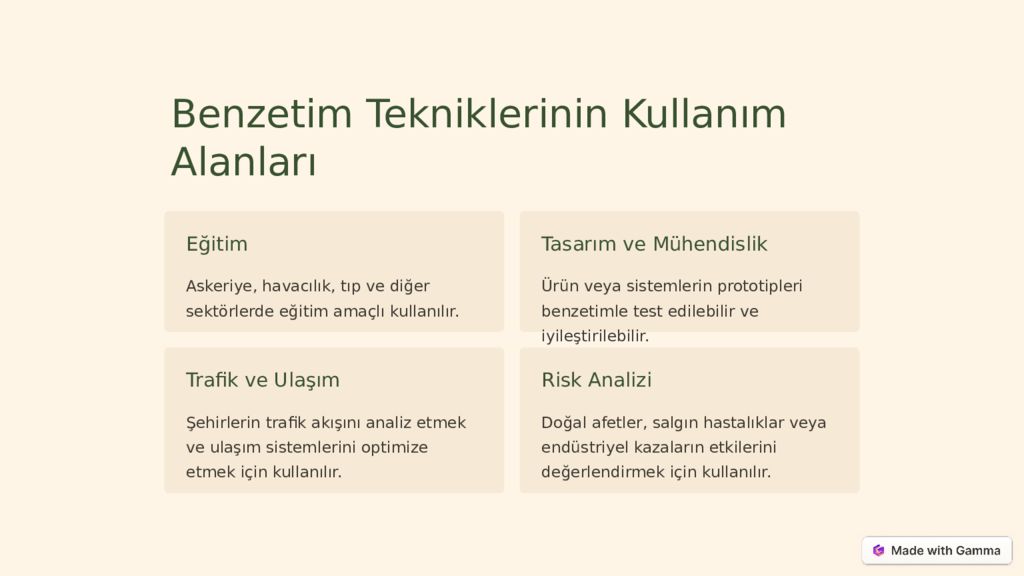 Benzetim Tekniklerinin Kullanım Alanları Eğitim Askeriye, havacılık, tıp ve diğer sektörlerde eğitim amaçlı kullanılır. Tasarım ve Mühendislik Ürün veya sistemlerin prototipleri benzetimle test edilebilir ve iyileştirilebilir. Trafik ve Ulaşım Şehirlerin trafik akışını analiz etmek ve ulaşım sistemlerini optimize etmek için kullanılır. Risk Analizi Doğal afetler, salgın hastalıklar veya endüstriyel kazaların etkilerini değerlendirmek için kullanılır.