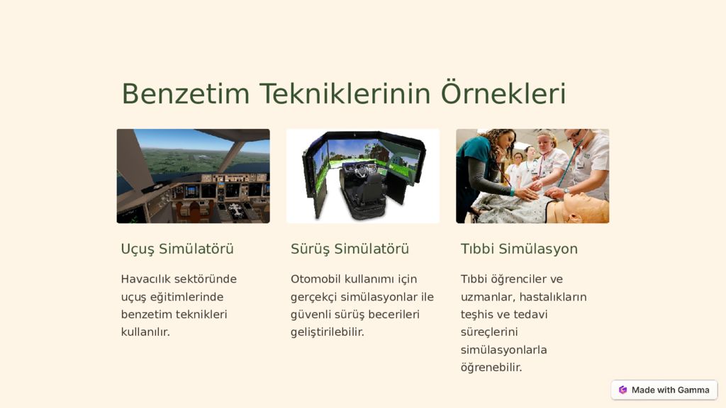 Benzetim Tekniklerinin Örnekleri Uçuş Simülatörü Havacılık sektöründe uçuş eğitimlerinde benzetim teknikleri kullanılır. Sürüş Simülatörü Otomobil kullanımı için gerçekçi simülasyonlar ile güvenli sürüş becerileri geliştirilebilir. Tıbbi Simülasyon Tıbbi öğrenciler ve uzmanlar, hastalıkların teşhis ve tedavi süreçlerini simülasyonlarla öğrenebilir.