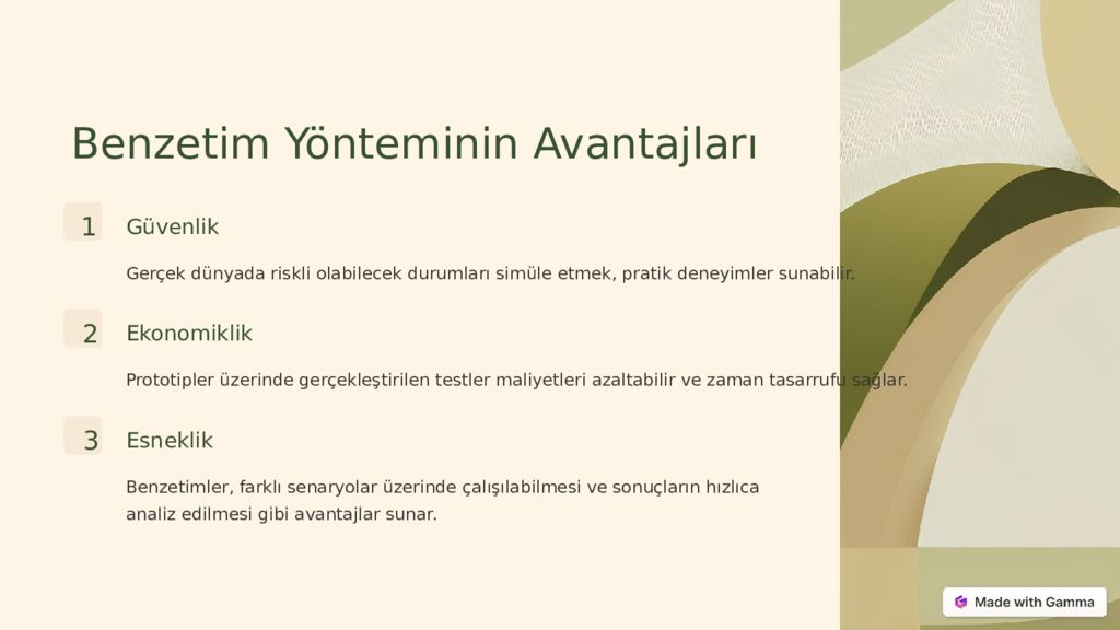Benzetim Yönteminin Avantajları 1 Güvenlik Gerçek dünyada riskli olabilecek durumları simüle etmek, pratik deneyimler sunabilir. 2 Ekonomiklik Prototipler üzerinde gerçekleştirilen testler maliyetleri azaltabilir ve zaman tasarrufu sağlar. 3 Esneklik Benzetimler, farklı senaryolar üzerinde çalışılabilmesi ve sonuçların hızlıca analiz edilmesi gibi avantajlar sunar.