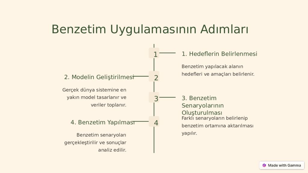 Benzetim Uygulamasının Adımları 1 1. Hedeflerin Belirlenmesi Benzetim yapılacak alanın hedefleri ve amaçları belirlenir. 2 2. Modelin Geliştirilmesi Gerçek dünya sistemine en yakın model tasarlanır ve veriler toplanır. 3 3. Benzetim Senaryolarının Oluşturulması Farklı senaryoların belirlenip benzetim ortamına aktarılması yapılır. 4 4. Benzetim Yapılması Benzetim senaryoları gerçekleştirilir ve sonuçlar analiz edilir.