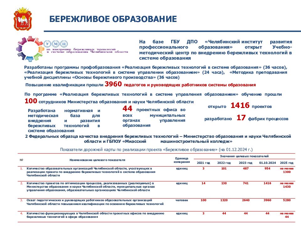 1 БЕРЕЖЛИВОЕ ОБРАЗОВАНИЕ Разработана нормативная и методическая база для внедрения и развития бережливых технологий в системе образования На базе ГБУ ДПО «Челябинский институт развития профессионального образования» открыт Учебно-методический центр по внедрению бережливых технологий в системе образования 44 проектных офиса во всех муниципальных органах управления образования Разработаны программы профобразования «Реализация бережливых технологий в системе образования» (36 часов), «Реализация бережливых технологий в системе управлении образованием» (24 часа), «Методика преподавания учебной дисциплины «Основы бережливого производства» (36 часов) Повышение квалификации прошли 3960 педагогов и руководящих работников системы образования По программе «Реализация бережливых технологий в системе управления образованием» обучение прошли 100 сотрудников Министерства образования и науки Челябинской области № Наименование целевого показателя Единица измерения Значения целевых показателей 2021 год 2022 год 2023 год 01.10.2024 2025 год 1. Количество образовательных организаций Челябинской области, участвующих в реализации проекта по внедрению бережливых технологий в системе образования Челябинской области единиц 3 10 1 487 954 не менее 1300 2. Количество проектов по оптимизации процессов, реализованных (реализуемых) в Министерстве образования и науки Челябинской области, муниципальных органах управления образования, образовательных организациях Челябинской области единиц 14 130 741 1416 не менее 1430 3. Охват педагогических и руководящих работников образовательных организаций Челябинской области повышением квалификации по освоению бережливых технологий человек 100 1320 2640 3960 5280 4. Количество функционирующих в Челябинской области проектных офисов по внедрению бережливых технологий в сфере образования единиц 3 44 44 44 не менее 44 открыто 1416 проектов Показатели дорожной карты по реализации проекта «Бережливое образование» (на 01.12.2024 г.) разработано 17 фабрик процессов 2 Федеральных образца качества внедрения бережливых технологий – Министерство образования и науки Челябинской области и ГБПОУ «Миасский машиностроительный колледж»
