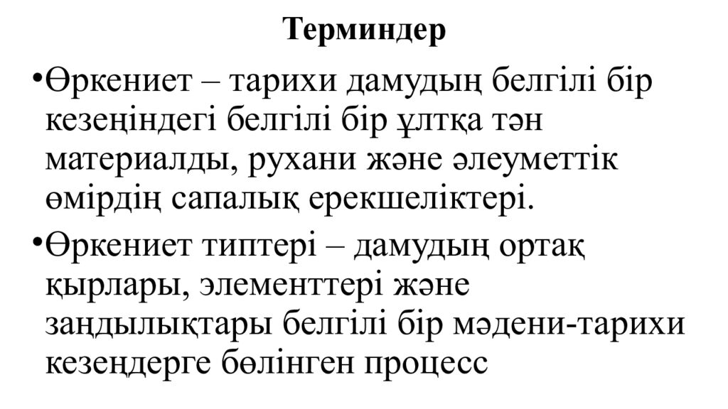 Өркениет – тарихи дамудың белгілі бір кезеңіндегі белгілі бір ұлтқа тән материалды, рухани және әлеуметтік өмірдің сапалық ерекшеліктері. Өркениет типтері – дамудың ортақ қырлары, элементтері және заңдылықтары белгілі бір мәдени-тарихи кезеңдерге бөлінген процесс