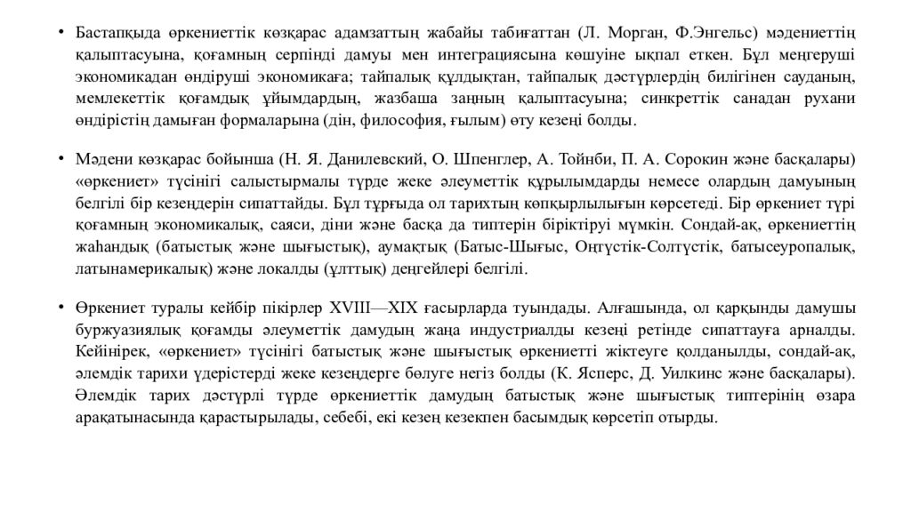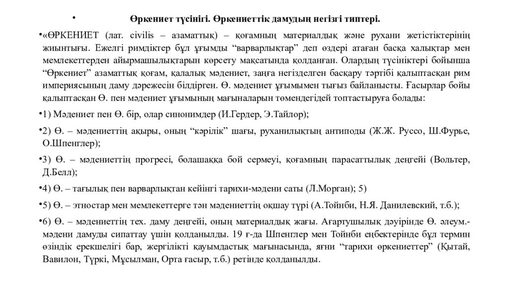 Өркениет түсінігі. Өркениеттік дамудың негізгі типтері. « ӨРКЕНИЕТ (лат. сіvіlіs – азаматтық) – қоғамның материалдық және рухани жетістіктерінің жиынтығы. Ежелгі римдіктер бұл ұғымды “варварлықтар” деп өздері атаған басқа халықтар мен мемлекеттерден айырмашылықтарын көрсету мақсатында қолданған. Олардың түсініктері бойынша “Өркениет” азаматтық қоғам, қалалық мәдениет, заңға негізделген басқару тәртібі қалыптасқан рим империясының даму дәрежесін білдірген. Ө. мәдениет ұғымымен тығыз байланысты. Ғасырлар бойы қалыптасқан Ө. пен мәдениет ұғымының мағыналарын төмендегідей топтастыруға болады: 1) Мәдениет пен Ө. бір, олар синонимдер (И.Гердер, Э.Тайлор); 2) Ө. – мәдениеттің ақыры, оның “кәрілік” шағы, руханилықтың антиподы (Ж.Ж. Руссо, Ш.Фурье, О.Шпенглер); 3) Ө. – мәдениеттің прогресі, болашаққа бой сермеуі, қоғамның парасаттылық деңгейі (Вольтер, Д.Белл); 4) Ө. – тағылық пен варварлықтан кейінгі тарихи-мәдени саты (Л.Морган); 5) 5) Ө. – этностар мен мемлекеттерге тән мәдениеттің оқшау түрі (А.Тойнби, Н.Я. Данилевский, т.б.); 6) Ө. – мәдениеттің тех. даму деңгейі, оның материалдық жағы. Ағартушылық дәуірінде Ө. әлеум.-мәдени дамуды сипаттау үшін қолданылды. 19 ғ-да Шпенглер мен Тойнби еңбектерінде бұл термин өзіндік ерекшелігі бар, жергілікті қауымдастық мағынасында, яғни “тарихи өркениеттер” (Қытай, Вавилон, Түркі, Мұсылман, Орта ғасыр, т.б.) ретінде қолданылды.