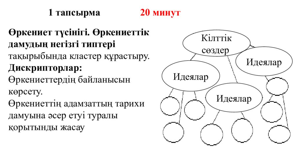 Өркениет түсінігі. Өркениеттік дамудың негізгі типтері тақырыбында кластер құрастыру. Дискрипторлар : Өркениеттердің байланысын көрсету. Өркениеттің адамзаттың тарихи дамуына әсер етуі туралы қорытынды жасау Кілттік сөздер Идеялар Идеялар Идеялар