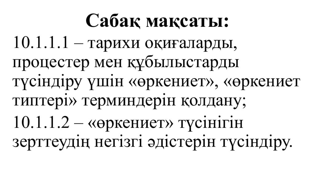 10.1.1.1 – тарихи оқиғаларды, процестер мен құбылыстарды түсіндіру үшін «өркениет», «өркениет типтері» терминдерін қолдану; 10.1.1.2 – «өркениет» түсінігін зерттеудің негізгі әдістерін түсіндіру.