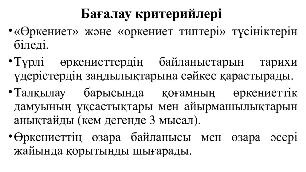 «Өркениет» және «өркениет типтері» түсініктерін біледі. Түрлі өркениеттердің байланыстарын тарихи үдерістердің заңдылықтарына сәйкес қарастырады. Талқылау барысында қоғамның өркениеттік дамуының ұқсастықтары мен айырмашылықтарын анықтайды (кем дегенде 3 мысал). Өркениеттің өзара байланысы мен өзара әсері жайында қорытынды шығарады.