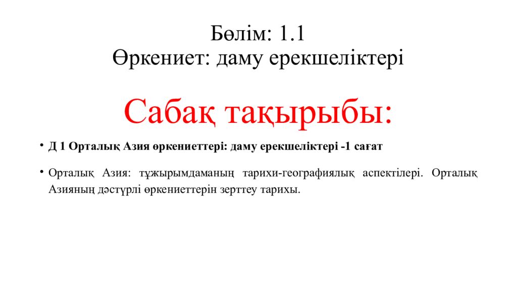Сабақ тақырыбы : Д 1 Орталық Азия өркениеттері: даму ерекшеліктері -1 сағат Орталық Азия: тұжырымдаманың тарихи-географиялық аспектілері. Орталық Азияның дәстүрлі өркениеттерін зерттеу тарихы.