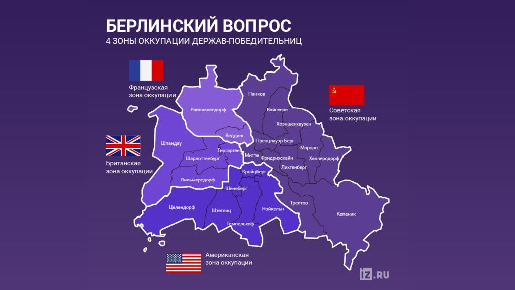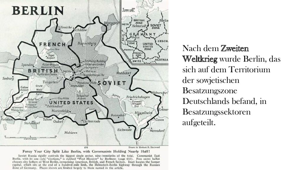 Nach dem Zweiten Weltkrieg wurde Berlin, das sich auf dem Territorium der sowjetischen Besatzungszone Deutschlands befand, in Besatzungssektoren aufgeteilt.
