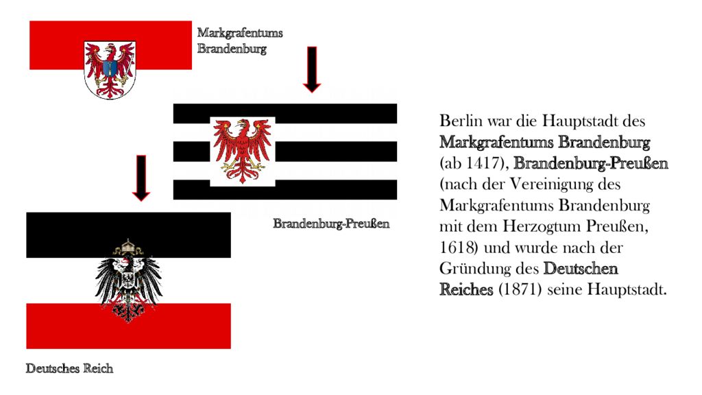 Berlin war die Hauptstadt des Markgrafentums Brandenburg (ab 1417), Brandenburg-Preußen (nach der Vereinigung des Markgrafentums Brandenburg mit dem Herzogtum Preußen, 1618) und wurde nach der Gründung des Deutschen Reiches (1871) seine Hauptstadt. Markgrafentums Brandenburg Brandenburg-Preußen Deutsche s Reich