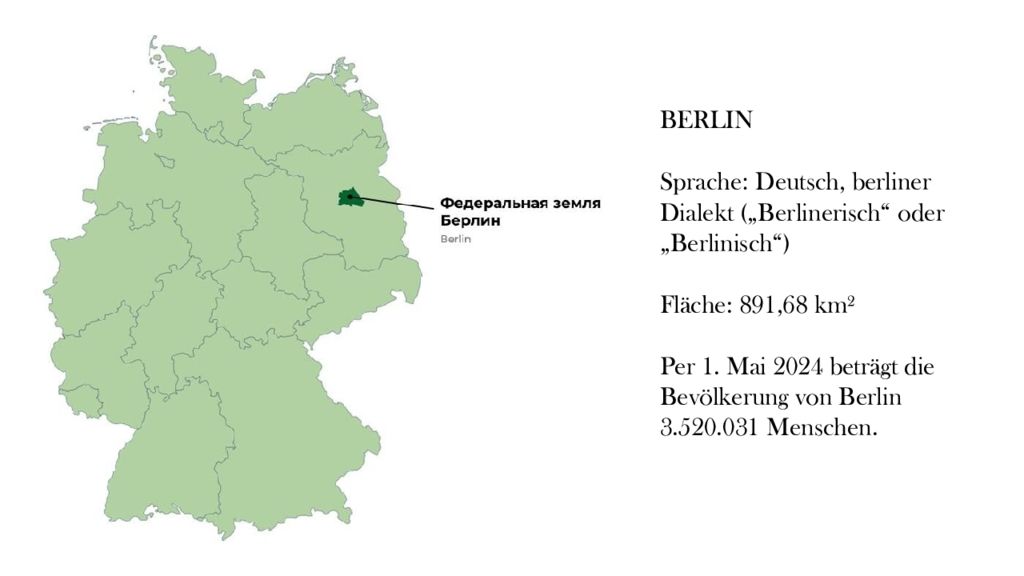 BERLIN Sprache : Deutsch, berliner Dialekt („Berlinerisch“ oder „Berlinisch“) Fläche: 891,68 km² Per 1. Mai 2024 beträgt die Bevölkerung von Berlin 3.520.031 Menschen.