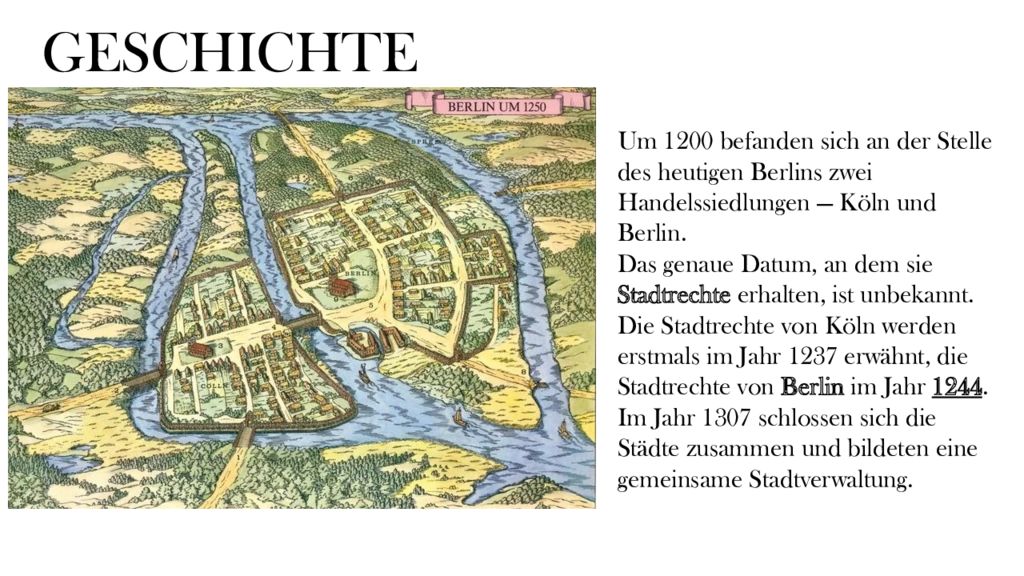 Um 1200 befanden sich an der Stelle des heutigen Berlins zwei Handelssiedlungen — Köln und Berlin. Das genaue Datum, an dem sie Stadtrechte erhalten, ist unbekannt. Die Stadtrechte von Köln werden erstmals im Jahr 1237 erwähnt, die Stadtrechte von Berlin im Jahr 1244. Im Jahr 1307 schlossen sich die Städte zusammen und bildeten eine gemeinsame Stadtverwaltung. GESCHICHTE