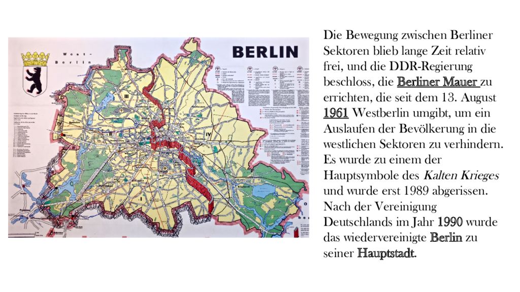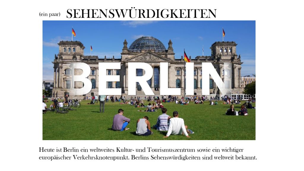 Heute ist Berlin ein weltweites Kultur- und Tourismuszentrum sowie ein wichtiger europäischer Verkehrsknotenpunkt. Berlins Sehenswürdigkeiten sind weltweit bekannt. SEHENSWÜRDIGKEITEN (ein paar)