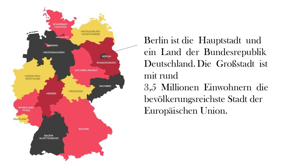 Berlin ist die Hauptstadt und ein Land der Bundesrepublik Deutschland. Die Großstadt ist mit rund 3,5 Millionen Einwohnern die bevölkerungsreichste Stadt der Europäischen Union.