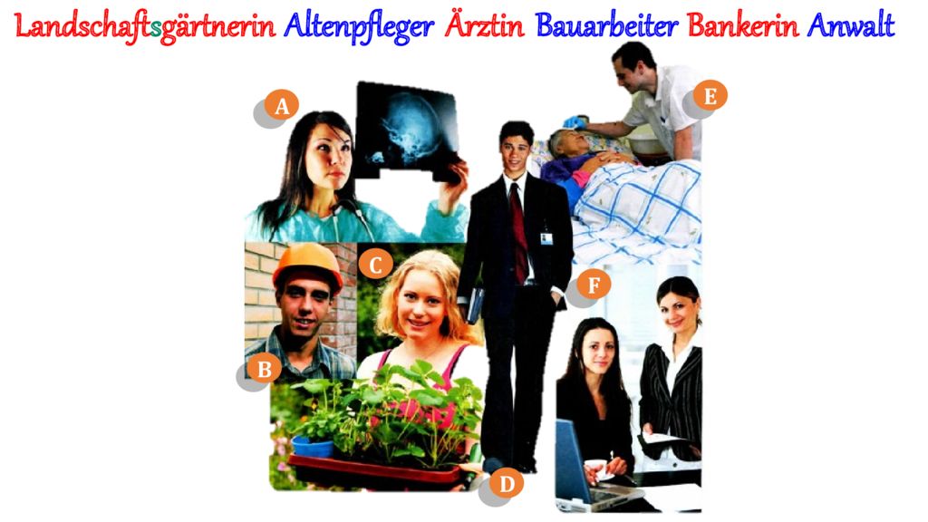 Ärztin Altenpfleger Landschaft s gärtnerin Bauarbeiter Anwalt Bank erin A C B E F D