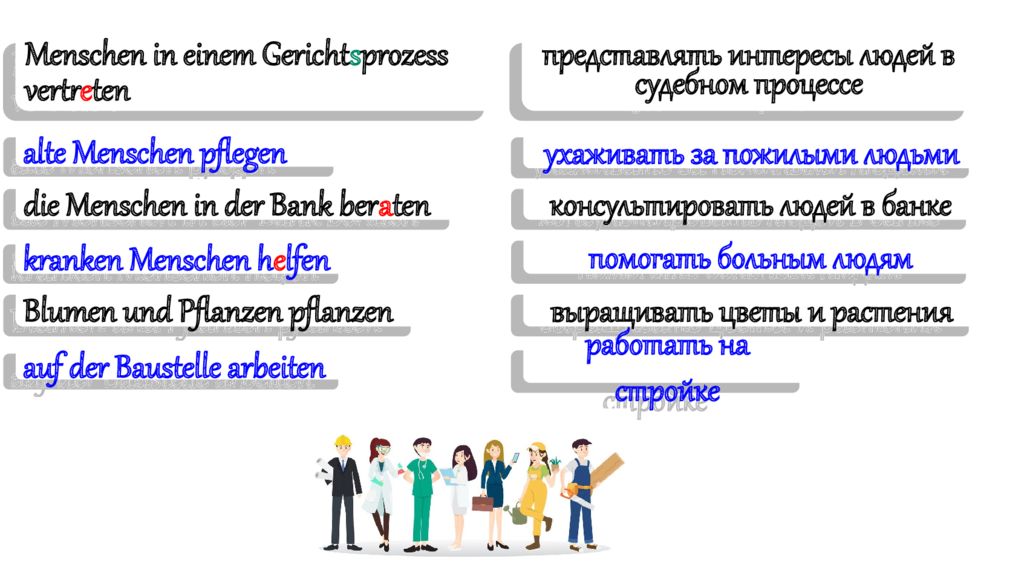 kranken Menschen h e lfen Menschen in einem Gericht s prozess vertr e ten alte Menschen pflegen Blumen und Pflanzen pflanzen auf der Baustelle arbeiten die Menschen in der Bank ber a ten представлять интересы людей в судебном процессе ухаживать за пожилыми людьми консультировать людей в банке выращивать цветы и растения помогать больным людям работать на стройке