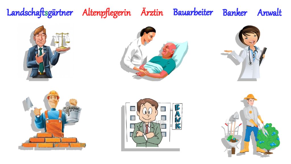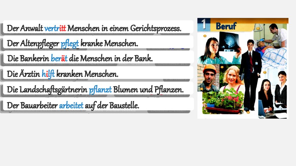 kranken Menschen h e lfen Menschen in einem Gerichtsprozess vertr e ten kranke Menschen pflegen Blumen und Pflanzen pflanzen auf der Baustelle arbeiten die Menschen in der Bank ber a ten Anwalt Altenpfleger Bankerin Landschaftsgärtnerin Ärztin Bauarbeiter Der Anwalt vertr itt Menschen in einem Gerichtsprozess. Der Altenpfleger pflegt kranke Menschen. Die Bankerin ber ä t die Menschen in der Bank. Die Ärztin h i lft kranken Menschen. Die Landschaftsgärtnerin pflanzt Blumen und Pflanzen. Der Bauarbeiter arbeitet auf der Baustelle.