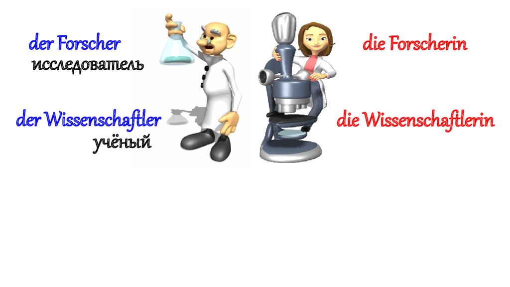 d ie Forscherin d er Forscher исследователь d er Wissenschaftler учёный d ie Wissenschaftl erin