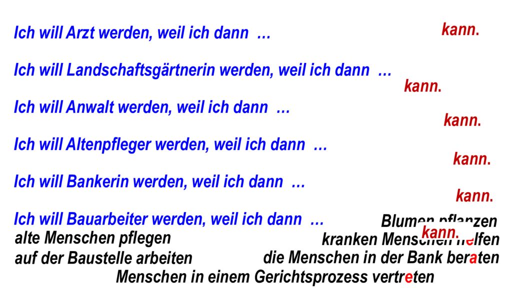 Ich will Arzt werden, weil ich dann … Ich will Landschaftsgärtnerin werden, weil ich dann … Ich will Anwalt werden, weil ich dann … Ich will Altenpfleger werden, weil ich dann … Ich will Bankerin werden, weil ich dann … Ich will Bauarbeiter werden, weil ich dann … kranken Menschen h e lfen Menschen in einem Gerichtsprozess vertr e ten alte Menschen pflegen Blumen pflanzen auf der Baustelle arbeiten die Menschen in der Bank ber a ten kann. kann. kann. kann. kann. kann.