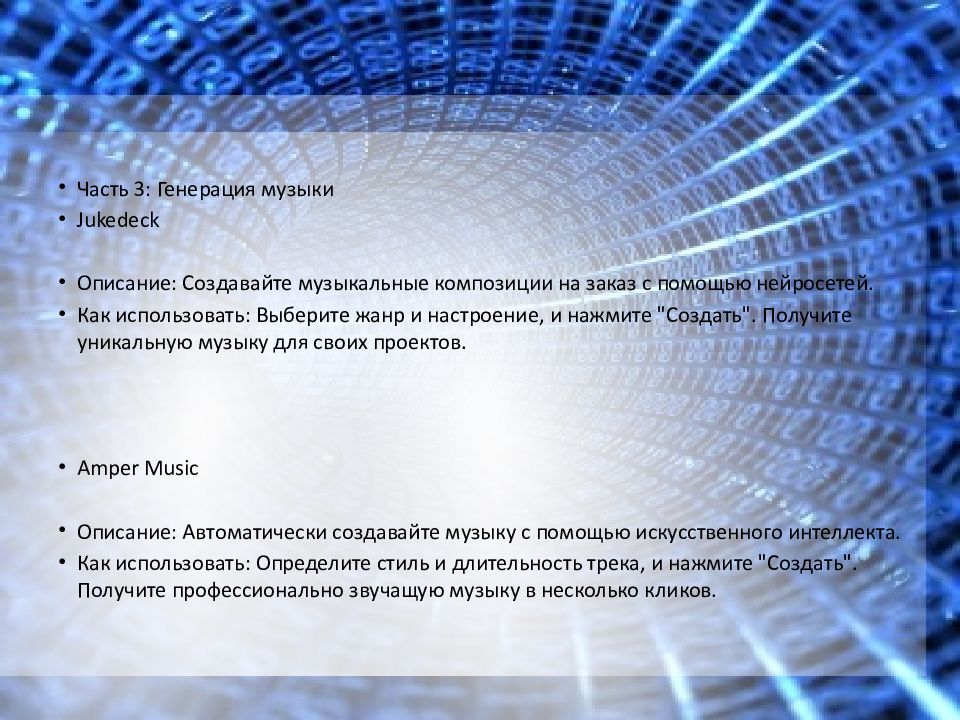 Часть 3: Генерация музыки Jukedeck Описание: Создавайте музыкальные композиции на заказ с помощью нейросетей. Как использовать: Выберите жанр и настроение, и нажмите "Создать". Получите уникальную музыку для своих проектов. Amper Music Описание: Автоматически создавайте музыку с помощью искусственного интеллекта. Как использовать: Определите стиль и длительность трека, и нажмите "Создать". Получите профессионально звучащую музыку в несколько кликов.
