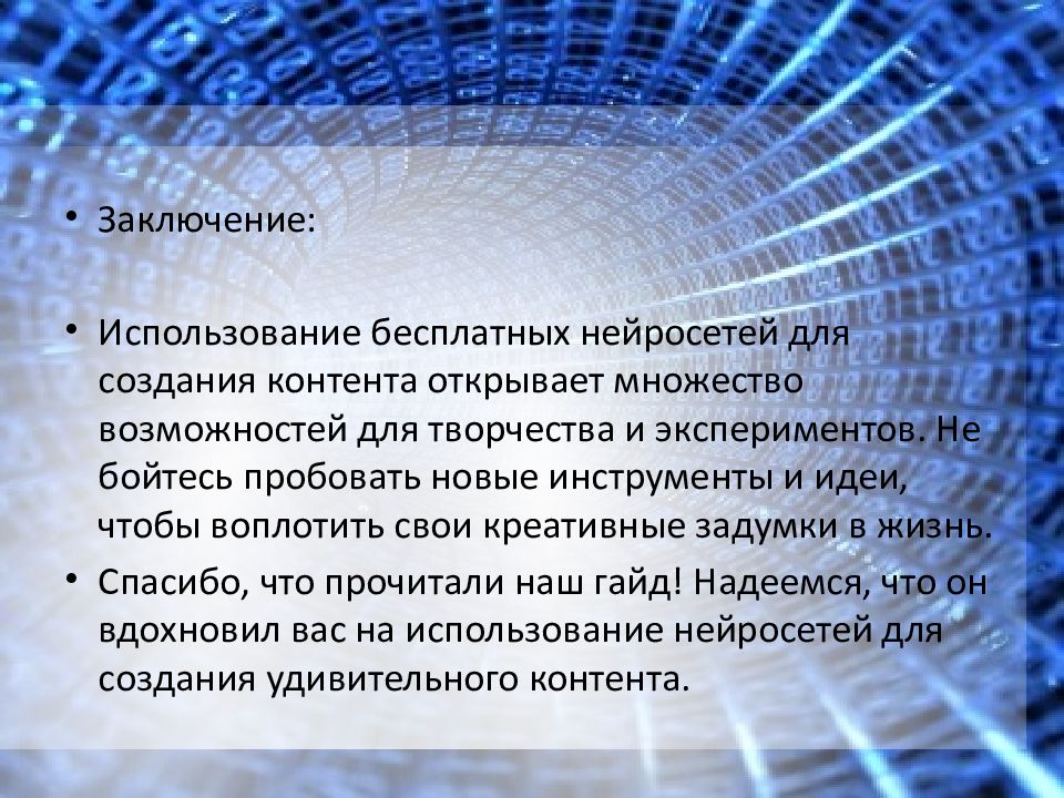 Заключение: Использование бесплатных нейросетей для создания контента открывает множество возможностей для творчества и экспериментов. Не бойтесь пробовать новые инструменты и идеи, чтобы воплотить свои креативные задумки в жизнь. Спасибо, что прочитали наш гайд ! Надеемся, что он вдохновил вас на использование нейросетей для создания удивительного контента.
