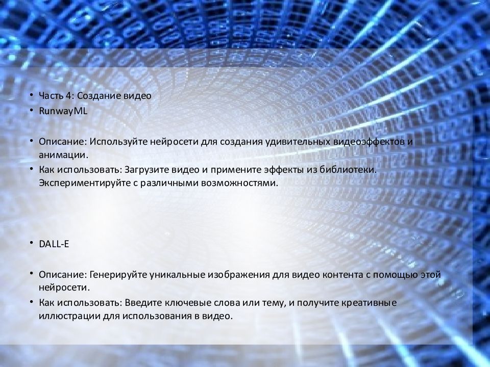 Часть 4: Создание видео RunwayML Описание: Используйте нейросети для создания удивительных видеоэффектов и анимации. Как использовать: Загрузите видео и примените эффекты из библиотеки. Экспериментируйте с различными возможностями. DALL-E Описание: Генерируйте уникальные изображения для видео контента с помощью этой нейросети. Как использовать: Введите ключевые слова или тему, и получите креативные иллюстрации для использования в видео.