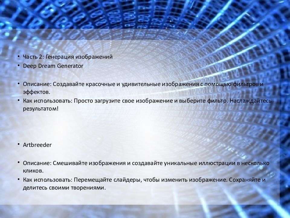 Часть 2: Генерация изображений Deep Dream Generator Описание: Создавайте красочные и удивительные изображения с помощью фильтров и эффектов. Как использовать: Просто загрузите свое изображение и выберите фильтр. Наслаждайтесь результатом! Artbreeder Описание: Смешивайте изображения и создавайте уникальные иллюстрации в несколько кликов. Как использовать: Перемещайте слайдеры, чтобы изменить изображение. Сохраняйте и делитесь своими творениями.