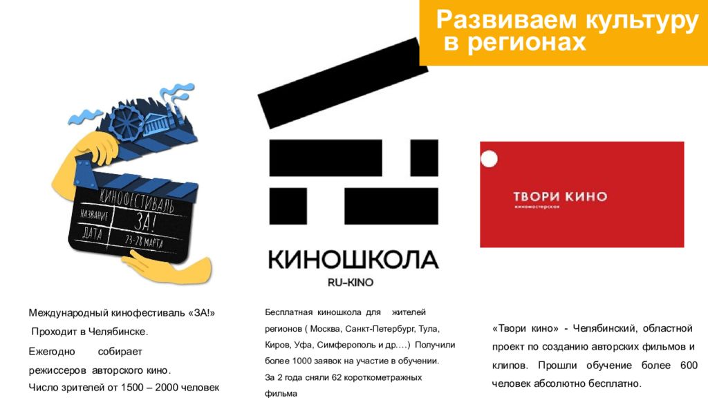 Международный кинофестиваль «ЗА!» Проходит в Челябинске. Еж е г о дн о с о б ира е т ре ж ис с е ров авторского кино. Число зрителей от 1500 – 2000 человек Бесплатная киношкола для жителей регионов ( Москва, Санкт-Петербург, Тула, Киров, Уфа, Симферополь и др.…) Получили более 1000 заявок на участие в обучении. За 2 года сняли 62 короткометражных фильма «Твори кино» - Челябинский, областной проект по созданию авторских фильмов и клипов. Прошли обучение более 600 человек абсолютно бесплатно.