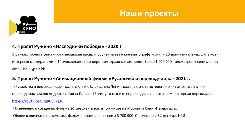 4. Проект Ру -кино «Наследники победы» - 2020 г. В рамках проекта участники киношколы прошли обучение азам кинематографа и сняли 20 документальных фильмов-интервью с ветеранами и 14 художественных короткометражных фильмов. Более 1 000 000 просмотров в социальных сетях. Конкурс ИРИ. 5. Проект Ру -кино «Анимационный фильм «Русалочка и переводчица» - 2021 г. «Русалочка и переводчица» - мультфильм о блокадном Ленинграде, в основе которого лежит дневник внучки переводчицы сказок Андерсена Анны Ганзен. 16 минут в технике перекладка на станке, компьютерная перекладка. https://youtu.be/JHqKCEFNj3U Привлечено к созданию фильма 20 специалистов, в том числе из Москвы и Санкт-Петербурга. Общее количество просмотров фильма в социальных сетях 3 700 000. Совместно с БФ к онкурс ИРИ.