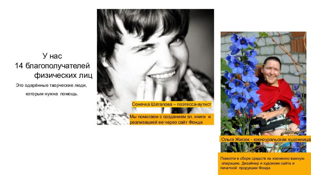 У нас 14 благополучателей физических лиц Это одарённые творческие люди, которым нужна помощь. Ольга Жисюк - южноуральская художница Помогли в сборе средств на жизненно важную операцию. Дизайнер и художник сайта и печатной продукции Фонда Сонечка Шаталова – поэтесса- аутист Мы помогаем с созданием эл. книги и реализацией ее через сайт Фонда