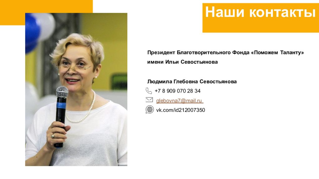 Президент Благотворительного Фонда «Поможем Таланту» имени Ильи Севостьянова Людмила Глебовна Севостьянова +7 8 909 070 28 34 glebovna7@mail.ru vk.co m /id212007350 Наши контакты