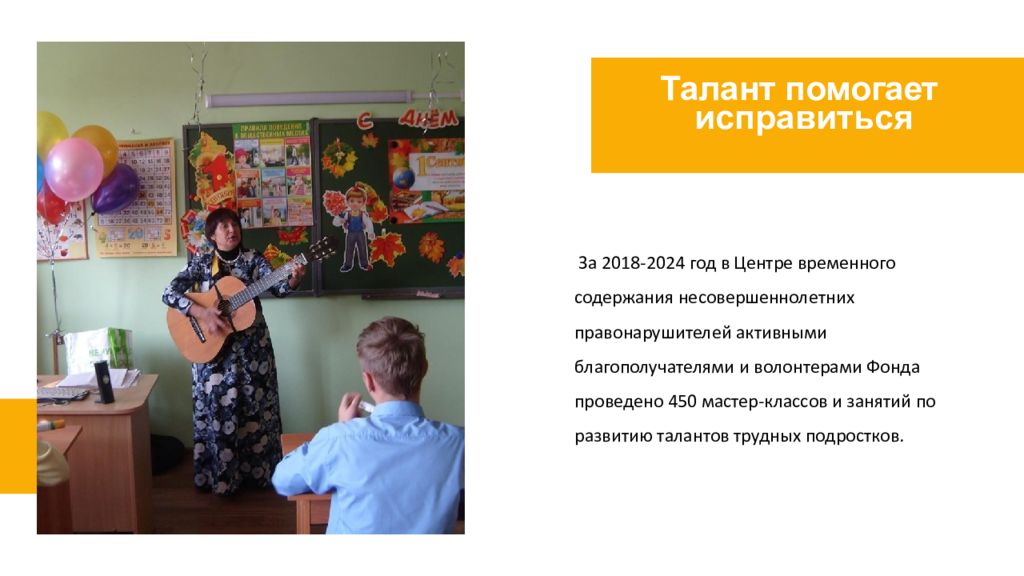 За 2018-202 4 год в Центре временного содержания несовершеннолетних правонарушителей активными благополучателями и волонтерами Фонда проведено 450 мастер-классов и занятий по развитию талантов трудных подростков. Талант помогает исправиться