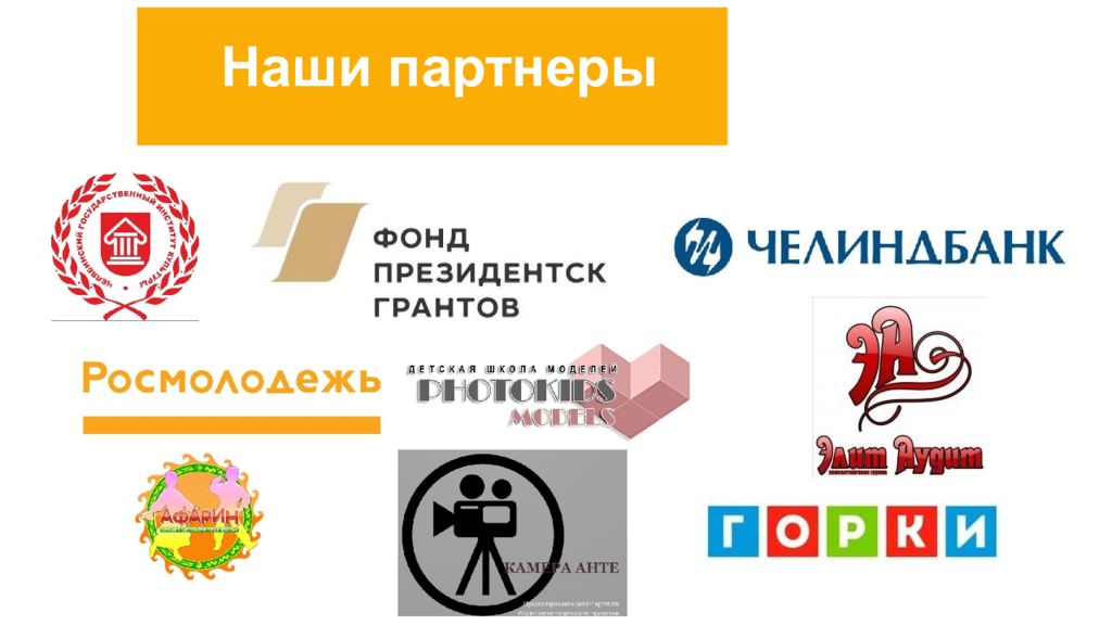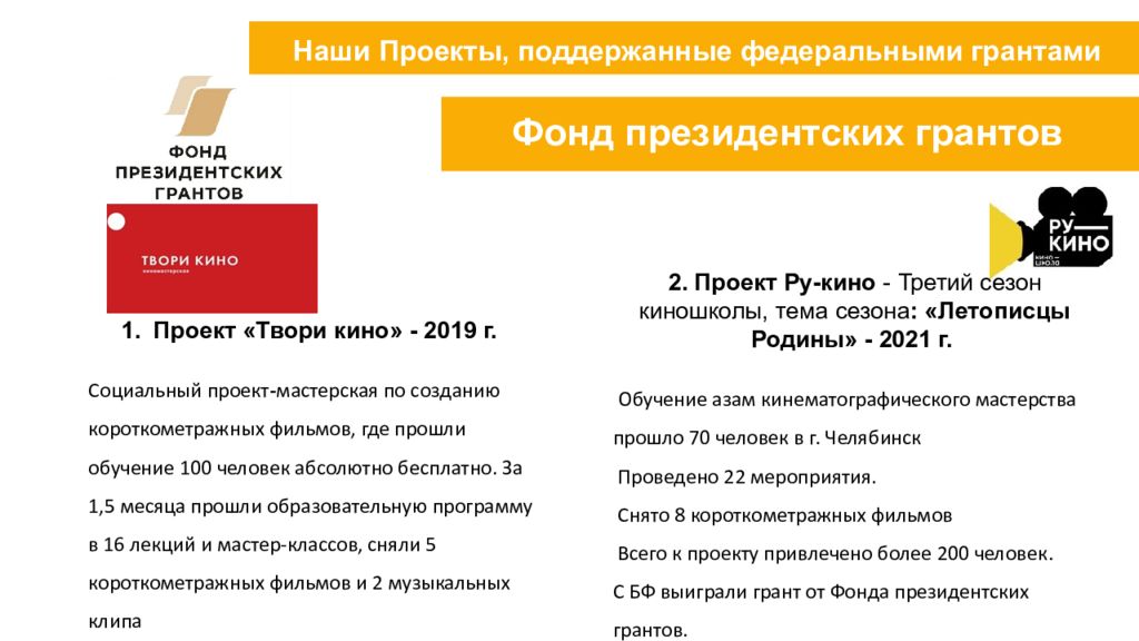 Проект «Твори кино» - 2019 г. Социальный проект - мастерская по созданию короткометражных фильмов, где прошли обучение 100 человек абсолютно бесплатно. За 1,5 месяца прошли образовательную программу в 16 лекций и мастер-классов, сняли 5 короткометражных фильмов и 2 музыкальных клипа 2. Проект Ру -кино - Третий сезон киношколы, тема сезона : «Летописцы Родины» - 2021 г. Обучение азам кинематографического мастерства прошло 70 человек в г. Челябинск Проведено 22 мероприятия. Снято 8 короткометражных фильмов Всего к проекту привлечено более 200 человек. С БФ выиграли грант от Фонда президентских грантов. Наши Проекты, поддержанные федеральными грантами