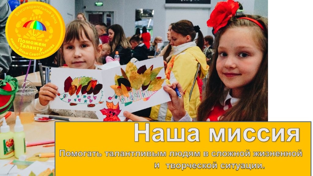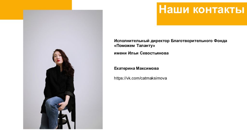 Исполнительный директор Благотворительного Фонда «Поможем Таланту» имени Ильи Севостьянова Екатерина Максимова https:// vk.com/catmaksimova Наши контакты