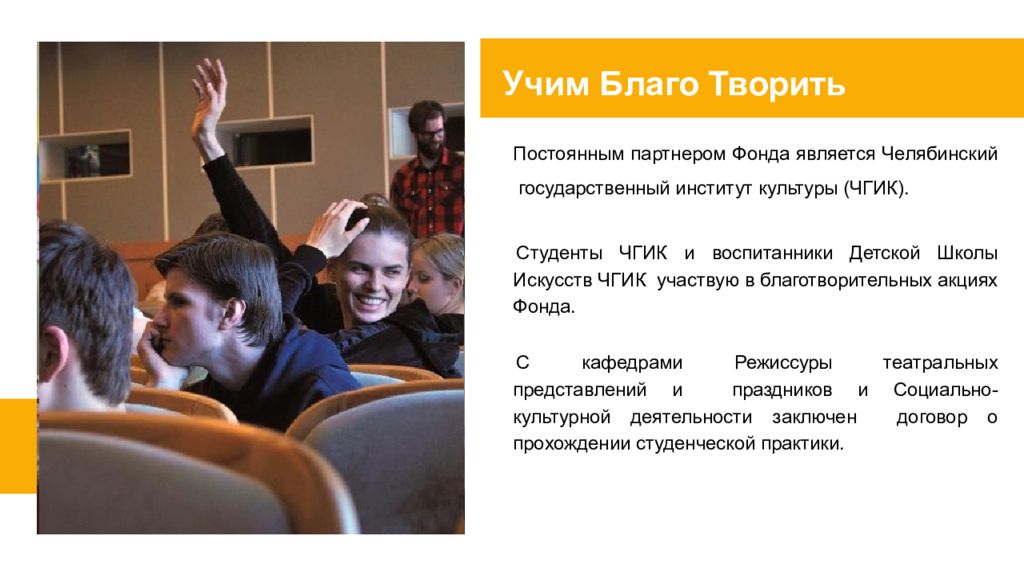 Постоянным партнером Фонда является Челябинский государственный институт культуры (ЧГИК ). Студенты ЧГИК и воспитанники Детской Школы Искусств ЧГИК участвую в благотворительных акциях Фонда. С кафедрами Режиссуры театральных представлений и праздников и Социально-культурной деятельности заключен договор о прохождении студенческой практики. Учим Благо Творить