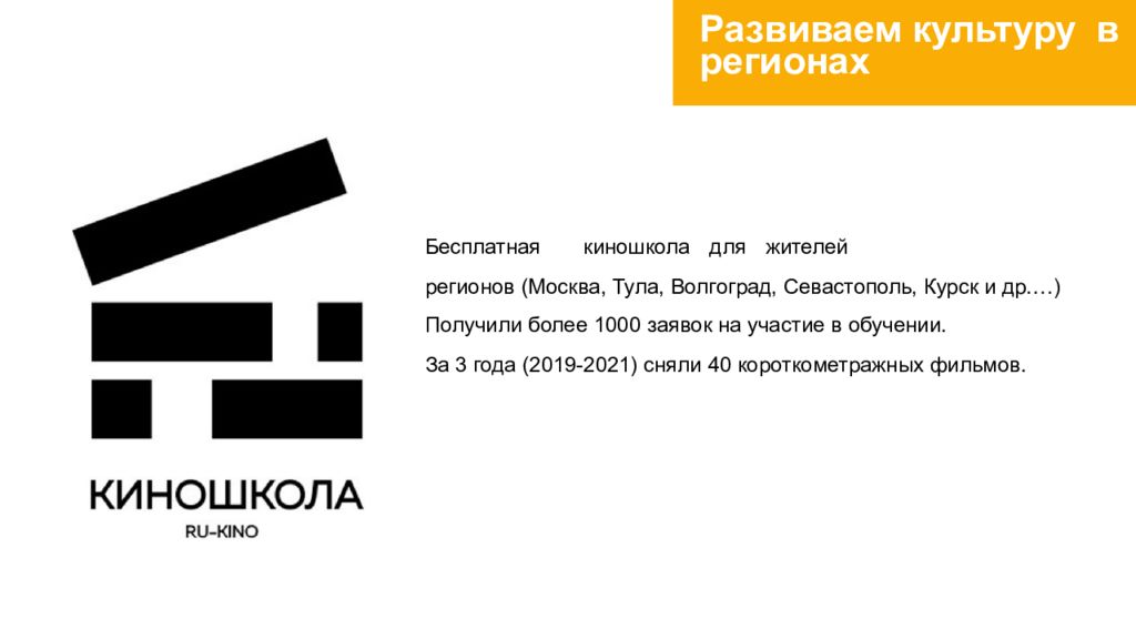 Бесплатная киношкола для жителей регионов ( Москва, Тула, Волгоград, Севастополь, Курск и др.…) Получили более 1000 заявок на участие в обучении. За 3 года (2019-2021) сняли 40 короткометражных фильмов.