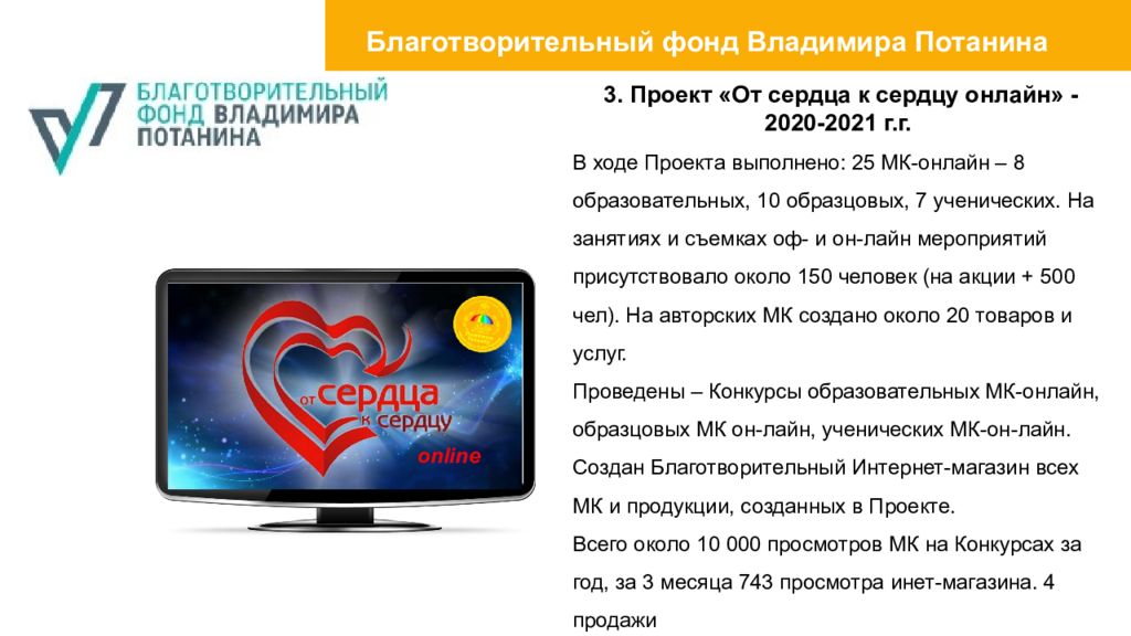 3. Проект «От сердца к сердцу онлайн» - 2020-2021 г.г. В ходе Проекта выполнено: 25 МК-онлайн – 8 образовательных, 10 образцовых, 7 ученических. На занятиях и съемках оф- и он- лайн мероприятий присутствовало около 150 человек (на акции + 500 чел). На авторских МК создано около 20 товаров и услуг. Проведены – Конкурсы образовательных МК-онлайн, образцовых МК он- лайн, ученических МК-он- лайн. Создан Благотворительный Интернет-магазин всех МК и продукции, созданных в Проекте. Всего около 10 000 просмотров МК на Конкурсах за год, за 3 месяца 743 просмотра инет-магазина. 4 продажи online