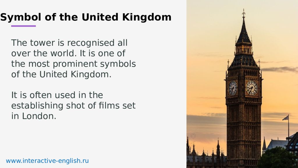 The tower is recognised all over the world. It is one of the most prominent symbols of the United Kingdom. It is often used in the establishing shot of films set in London. Symbol of the United Kingdom www.interactive-english.ru