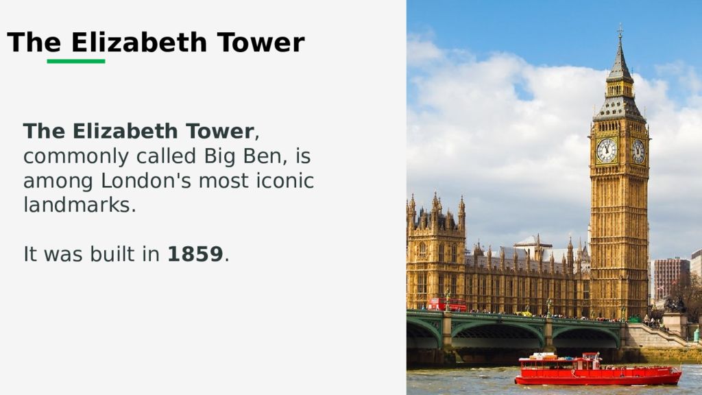 The Elizabeth Tower, commonly called Big Ben, is among London's most iconic landmarks. It was built in 1859. The Elizabeth Tower